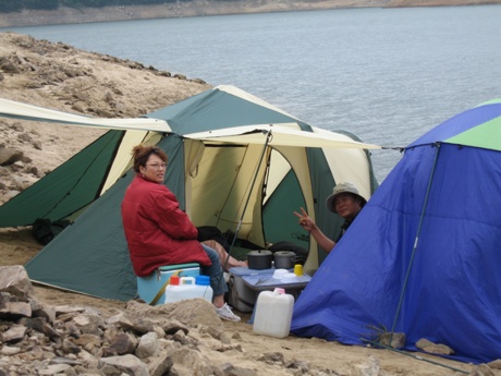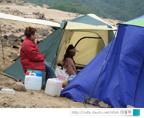 대를 펴고 아침겸 점심을 먹으면서 잠시의 휴식을 취하고 있는 모습