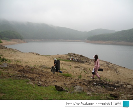또한 저수지는 맨바닥이다. 군데 군데 모래와 마사토 그리고 돌무더기들이 널려 있어 생미끼 낚시는 틀려보였다. 우리는 자리를 정하고 짐을 옮겨 대를 펴본다.