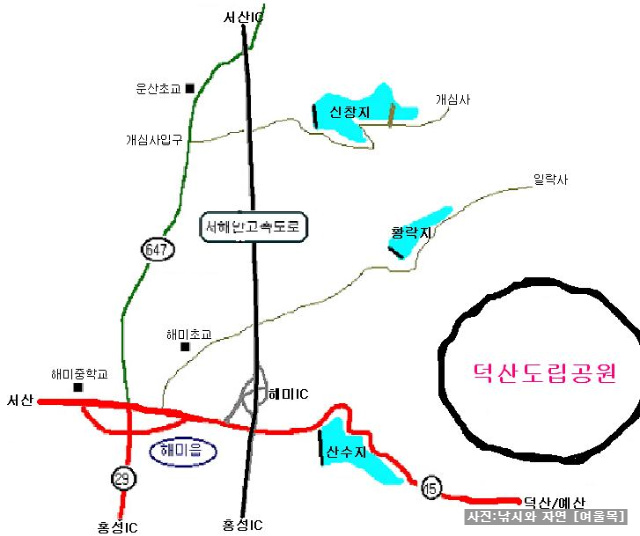 신창지는 개심사 진입로변의 약10만평규모의 계곡형 저수지이다. 새터지라고도 불리우고 있는데 경사가 심하여 앉을 자리가 그리 많지 않다. 낚시인들이 버리고간 쓰레기로 인하여 개심사에서 낚시를 금지시키고 있다고 한다.